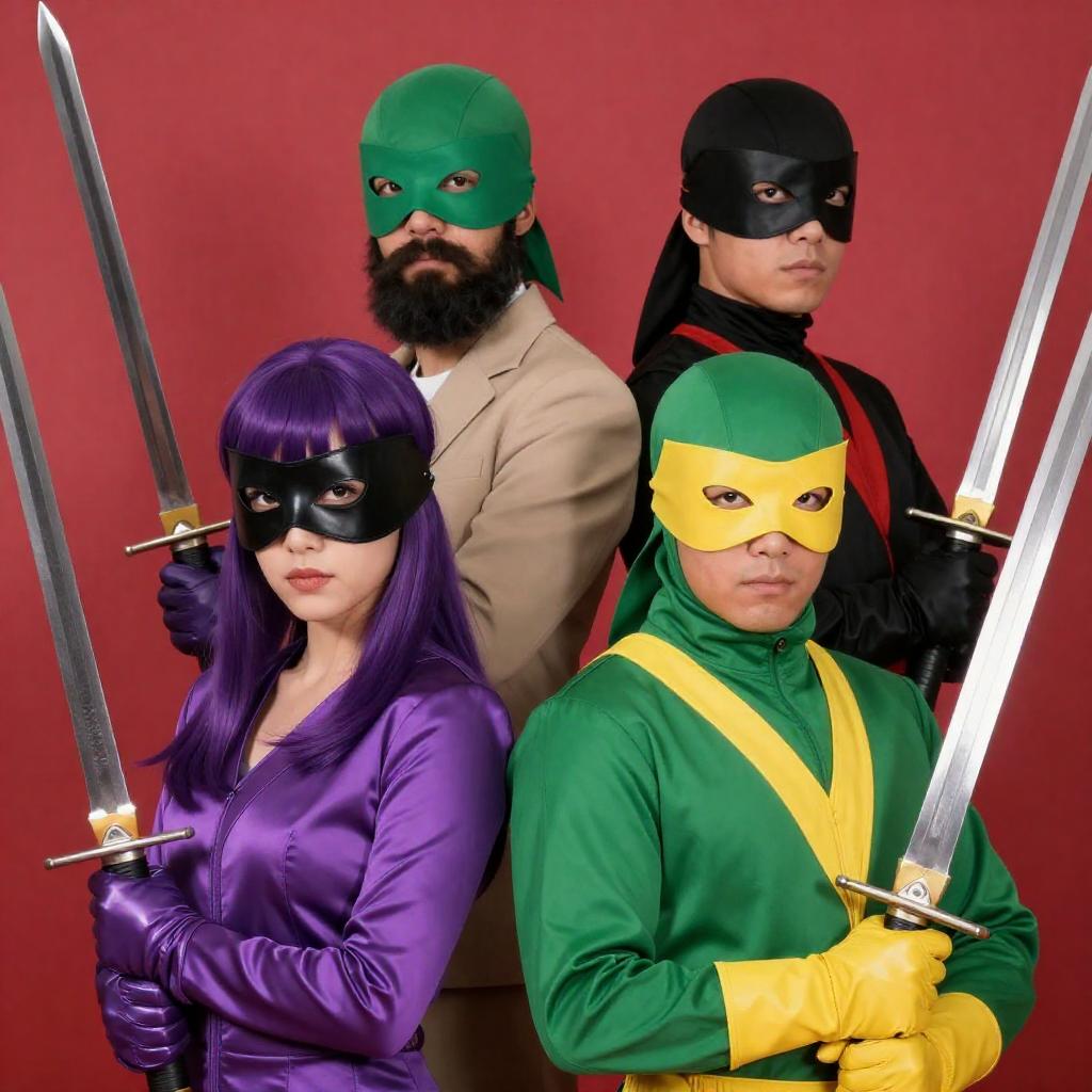 Photograph of four superheroes in dynamic poses. Left: military-clothed man with green mask, blue gun, tan camouflage. Center: woman with purple bob haircut, purple suit, black mask, silver sword. Right: man in green and yellow suit, yellow gloves, katana. Far right: man in black mask, black outfit, red accents, dual guns. Background: colorful gradient. Each character intense expressions, holding weapons.