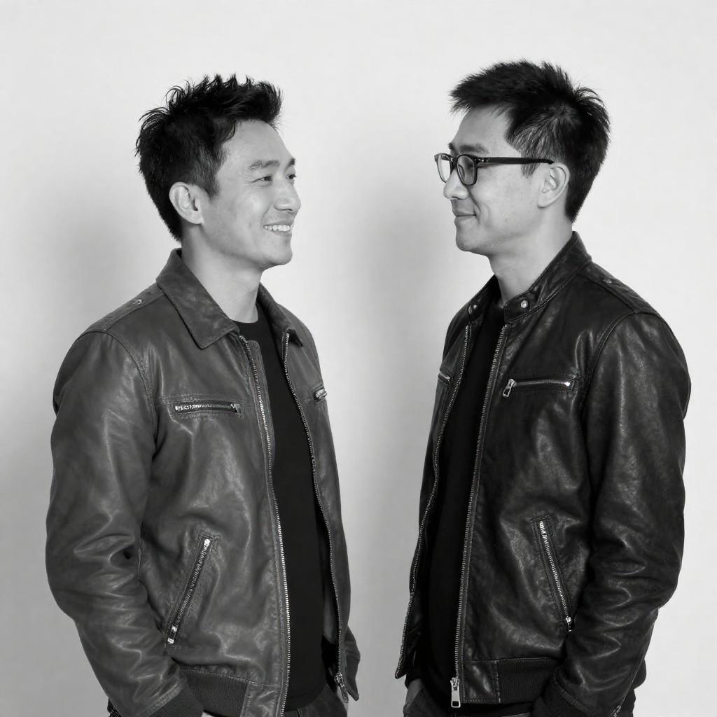 Two young Asian men standing against a grey concrete wall. The man on the right wears a navy blue hoodie and playfully touches the chin of the man on the left, who is dressed in a light blue button-up shirt. Both men have short black hair and are smiling at each other in bright daylight.