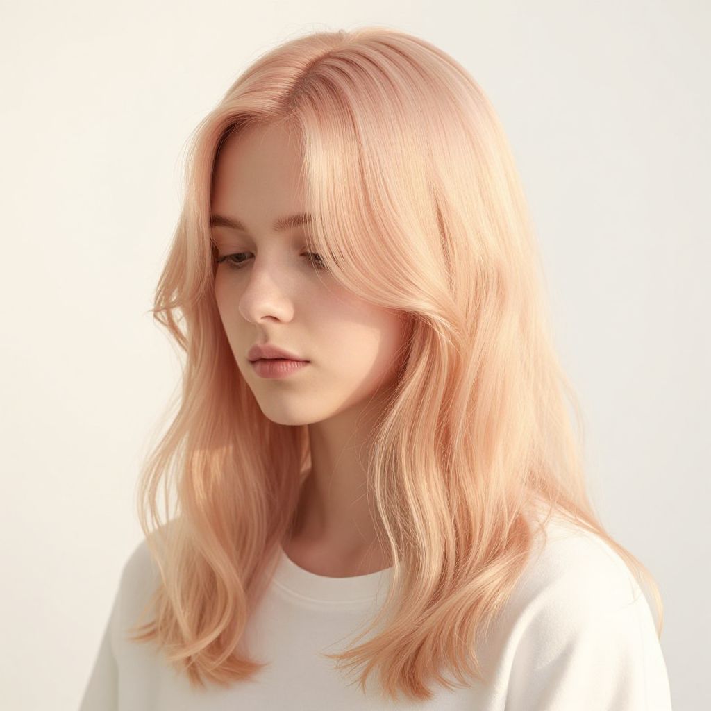 Photograph of a young woman with long, wavy, pastel pink-blond hair. She has fair skin and is wearing a plain white shirt. Her eyes are downcast, and her expression is neutral. The background is a bright, solid white, making her hair and face the focal points. The lighting is soft, highlighting the texture and color of her hair. The image has a clean, minimalistic style, emphasizing her delicate features and pastel hair color.