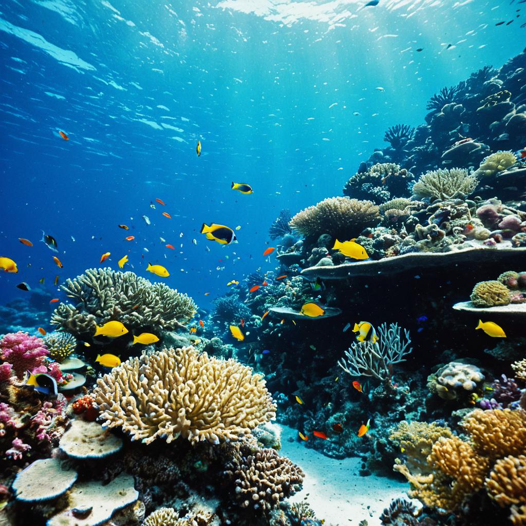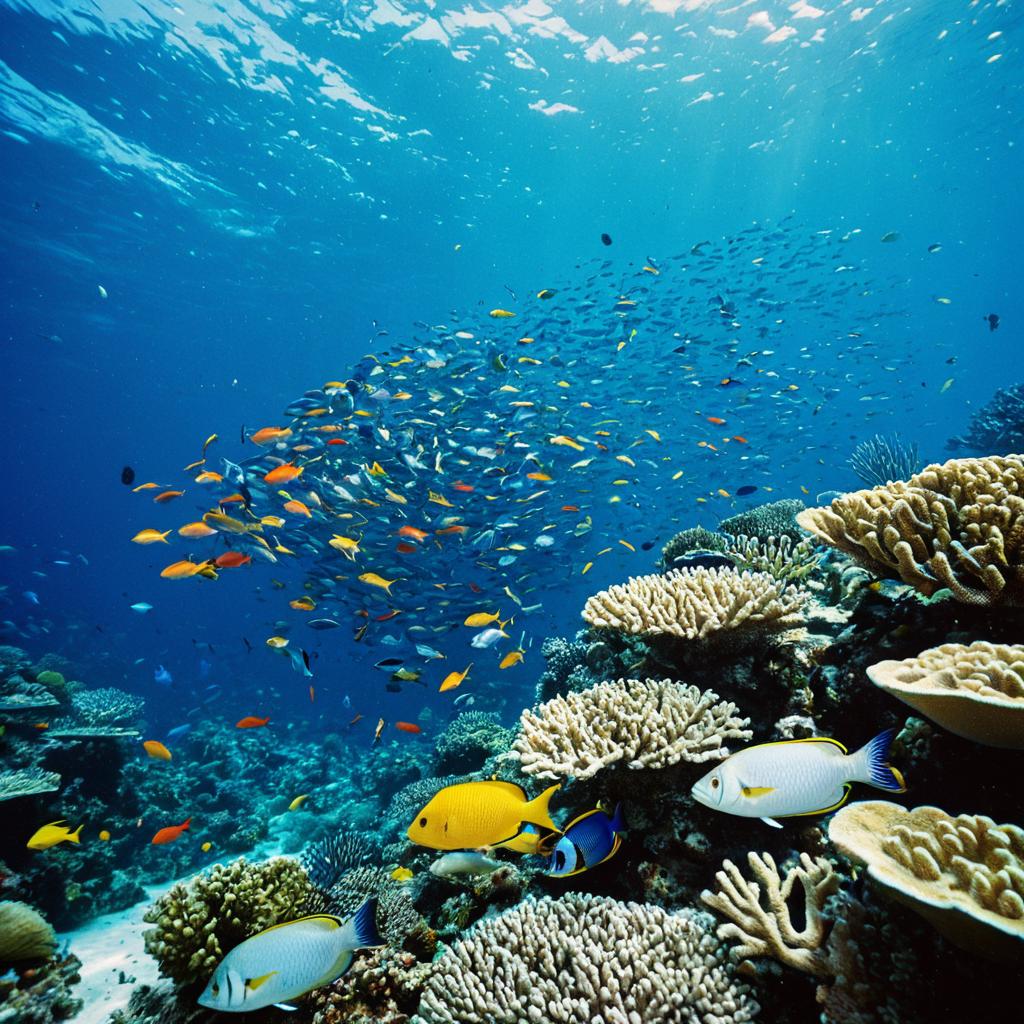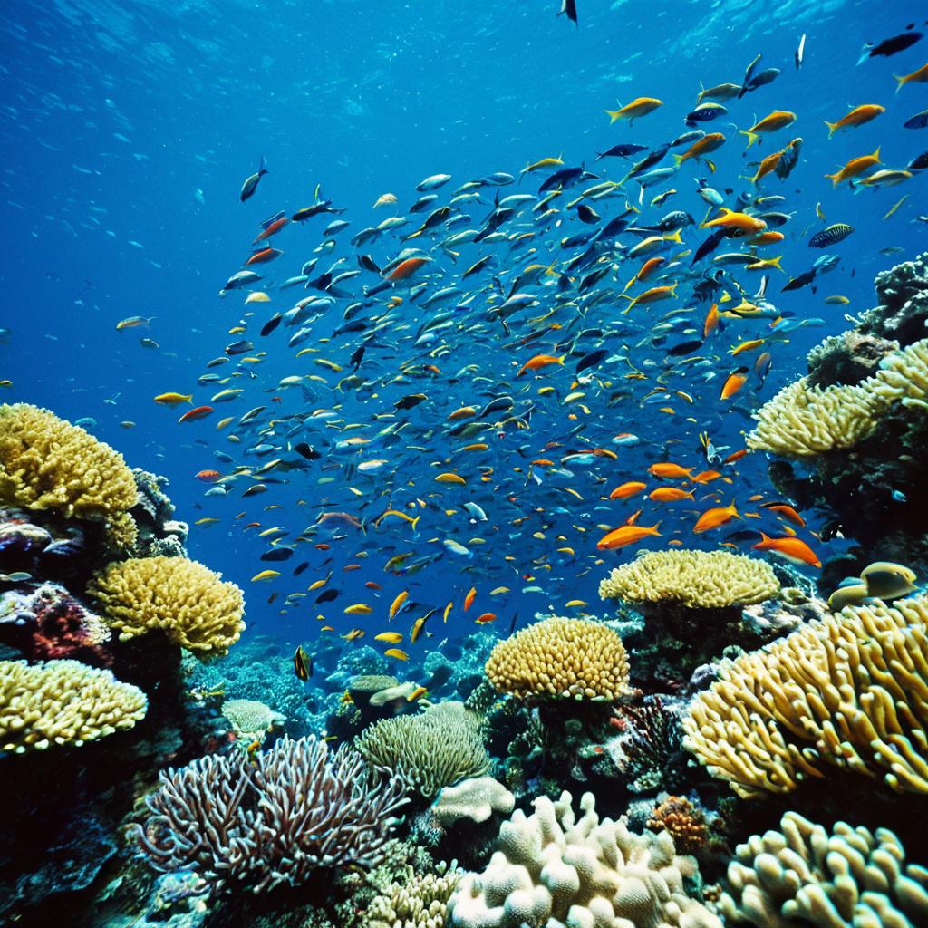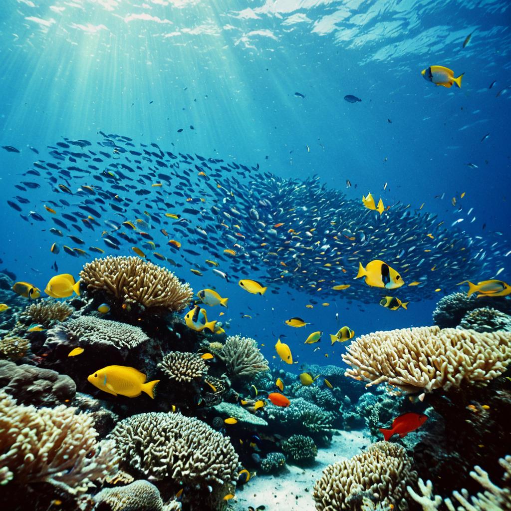 Underwater image showing a large school of colorful tropical fish swimming above a vibrant coral reef. The scene features diverse coral formations in shades of yellow, cream, and purple with deep blue ocean water surrounding the marine life.