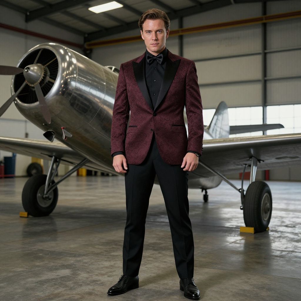 A man, burgundy brocade dinner jacket, black dress shirt, black silk bow tie, black tailored trousers, matte black monk strap shoes, vintage aircraft on display, polished metal fuselages, expansive hangar space, cinematic film style, confident expression Man has masculine face and piercing eyes