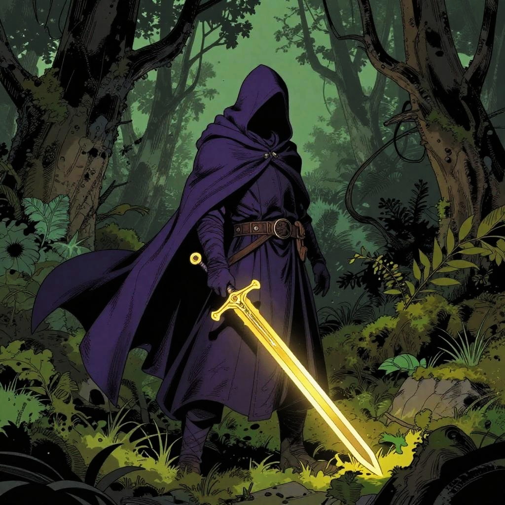 A dark fantasy scene featuring a cloaked figure with a hooded purple cloak, holding a glowing golden sword, standing on a mossy forest floor surrounded by twisted trees and dense foliage. The atmosphere is moody and mysterious, with intricate linework and detailed textures creating a comic book art style. The scene uses muted green and purple colors with shadowy tones to enhance the eerie and adventurous mood.
