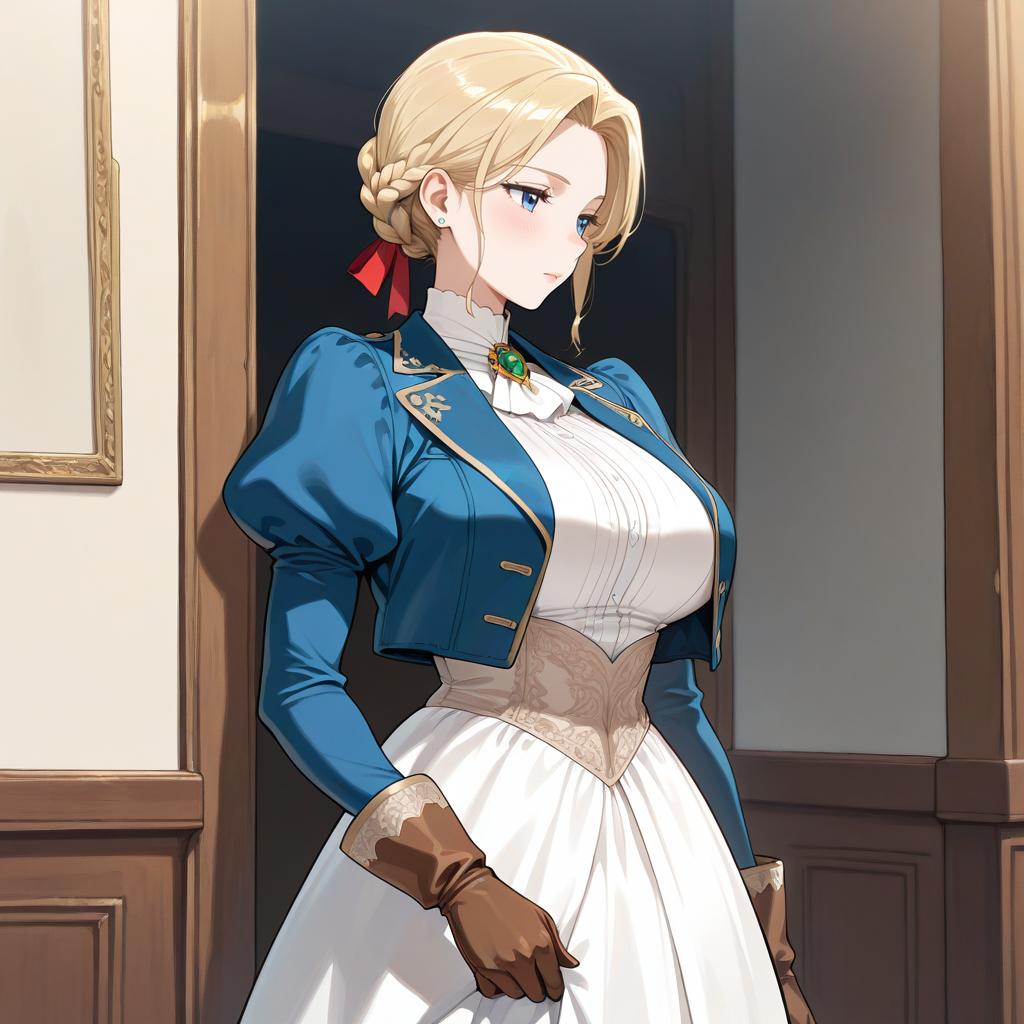 (masterpiece, best quality), intricate details, 1girl, blonde hair, hair ribbon, ribbon, short hair, braids, hair braids, red ribbon, mature female, blue jacket, brown gloves, cropped jacket, dress, gloves, green brooch, jacket, juliet sleeves, long sleeves, puffy sleeves, white dress, black eyes
