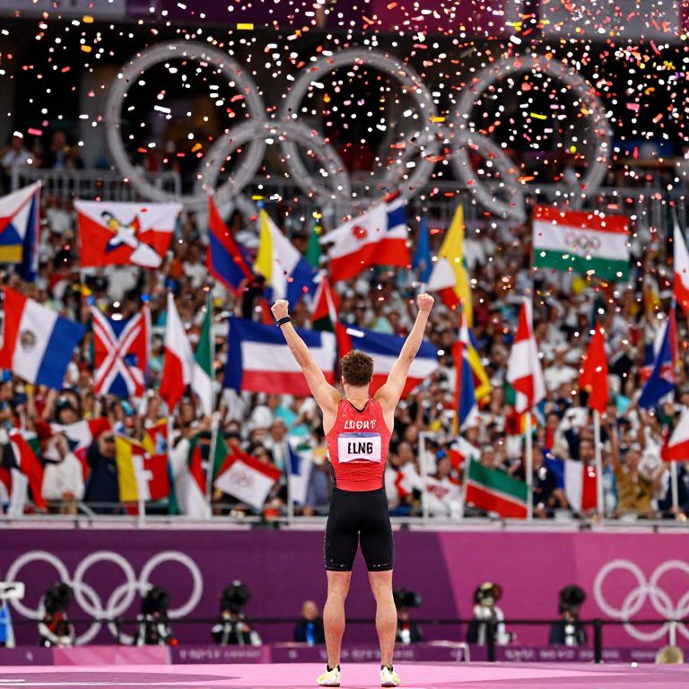 Photograph of a male wrestler from behind, arms raised, celebrating with confetti, amidst a crowd waving national flags and Olympic rings.