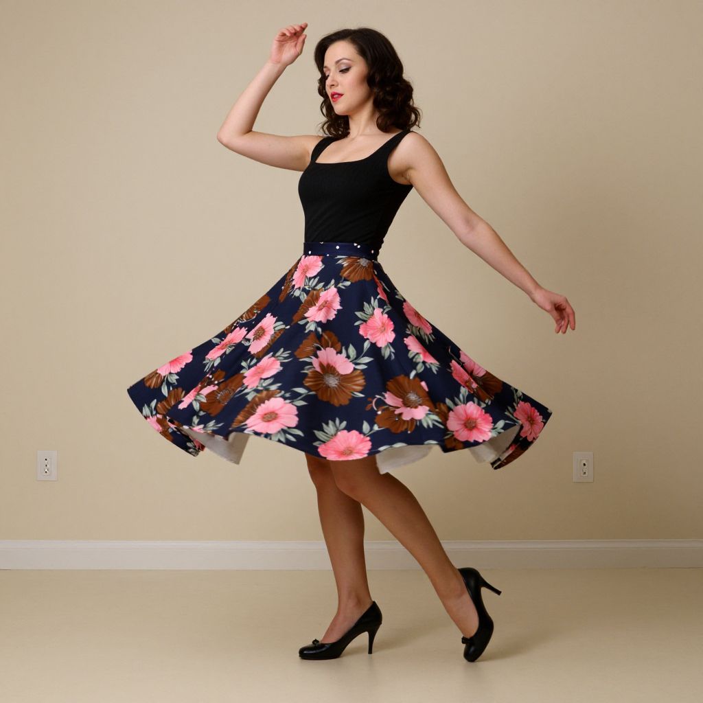 Woman twirling gracefully in a 1950s-inspired rockabilly swing skirt featuring a bold floral print of pink and brown blossoms against a navy background, paired with a black sleeveless top and black heels, set against a minimalist beige wall with two electrical outlets visible to her sides.