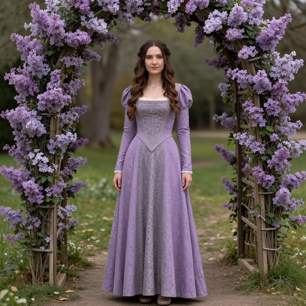 Lilac medieval dress, woman in a purple dress standing in front of a purple flowered archway