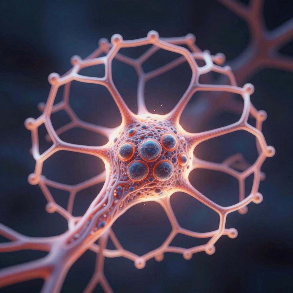 Imagegfap, conceptual art showing the protein network inside neural tissue, glowing strands interconnected in a vast web, rendered with a blend of science illustration and fantasy graphic art, detailed and immersive