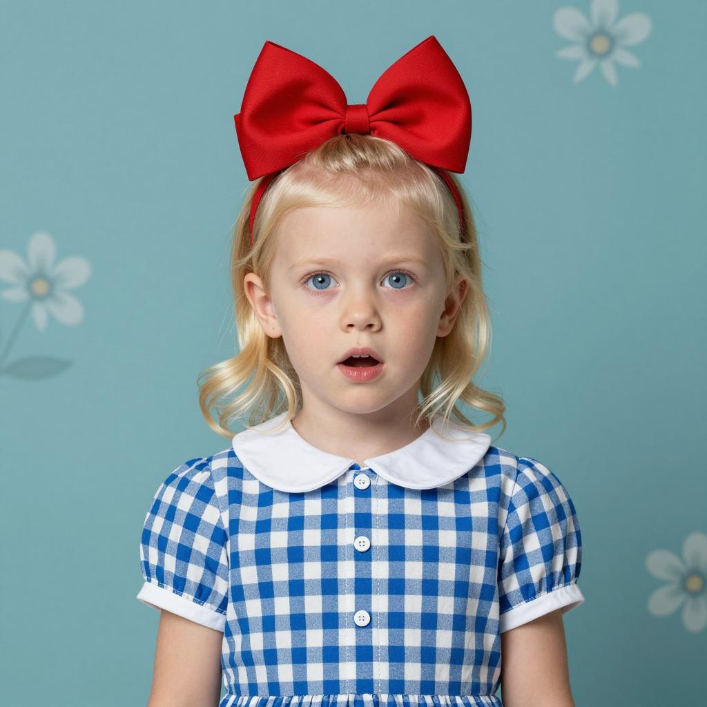 Child with blonde hair, blue eyes, and a red bow, wearing a blue and white checkered dress with a white collar. Background is teal with subtle floral patterns. Child has a surprised expression. Upper body shot, centered.