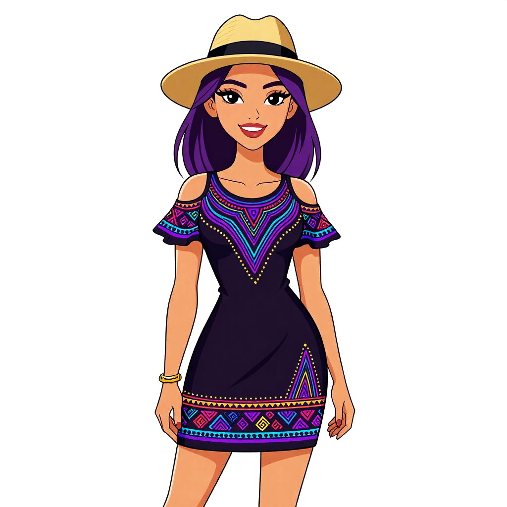 Digital illustration of a confident woman with medium brown skin and wavy, vibrant purple hair. She wears a colorful, floral-patterned outfit consisting of a short-sleeved, V-neck top and a knee-length skirt with a high side slit, revealing her left leg. The outfit features red, blue, and yellow flowers on a black background, accented with purple and yellow trim. She accessorizes with a gold necklace and black, strappy sandals. Her makeup includes bold red lipstick and dark eye makeup. The background is plain white, highlighting her striking appearance and vibrant attire. The illustration style is bold and colorful, reminiscent of modern, digital pop art.