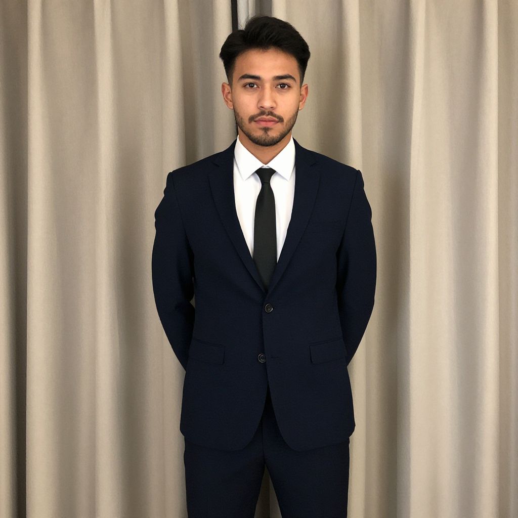 Photograph of a young Asian man with short black hair and a trimmed beard, standing straight with his hands in his pants pockets. He is wearing a dark navy blue suit with a white dress shirt and a black tie. The background features vertical beige curtains, creating a neutral, professional setting. The man's expression is neutral, and he looks directly at the camera. The image has a slightly over-exposed effect, giving it a bright and crisp appearance.