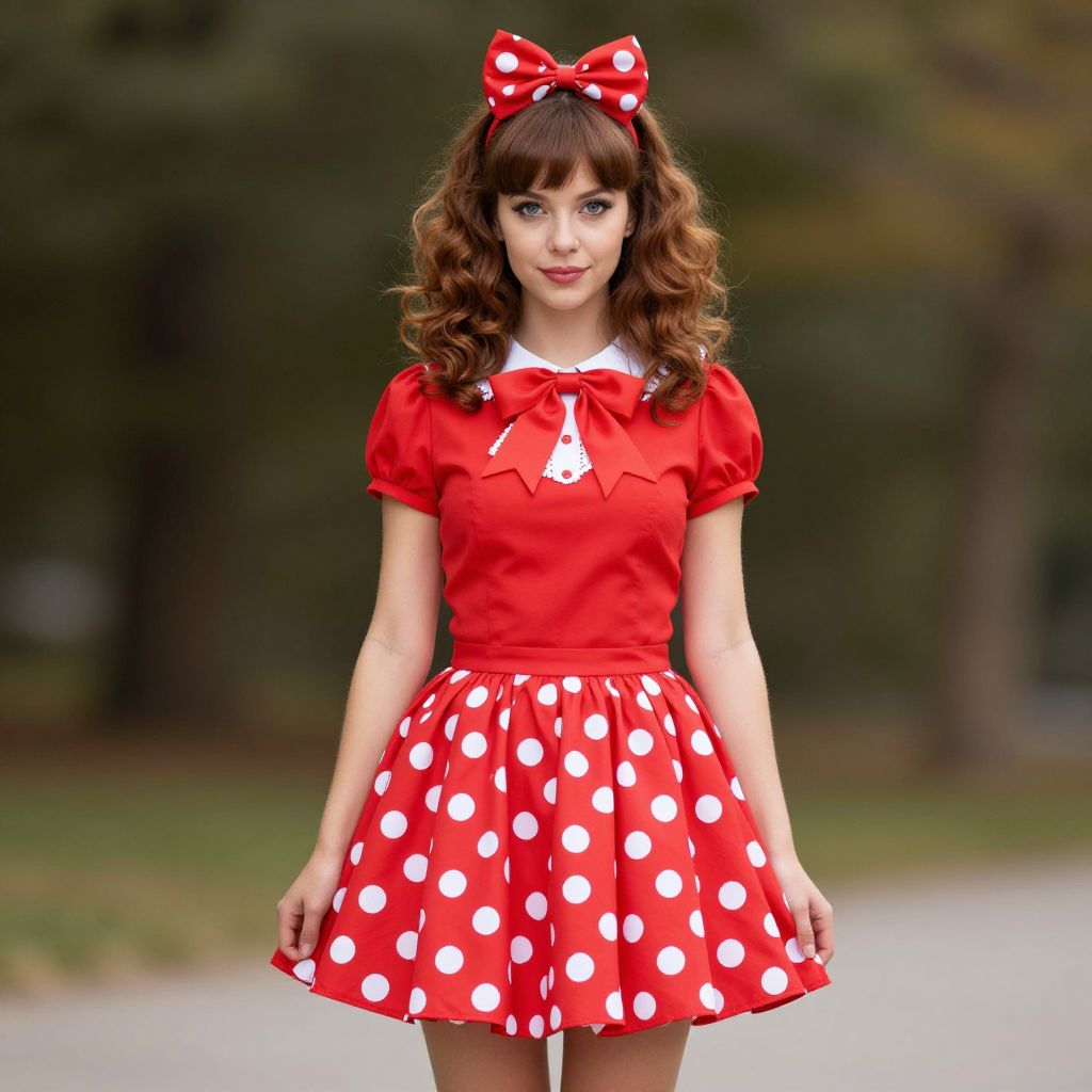 Classic marilyn costume, 1girl, solo, polka dot dress, blonde hair, dress, twintails, red dress, polka dot, red footwear, standing, full body, bow, white bow, short sleeves, realistic, puffy sleeves, puffy short sleeves