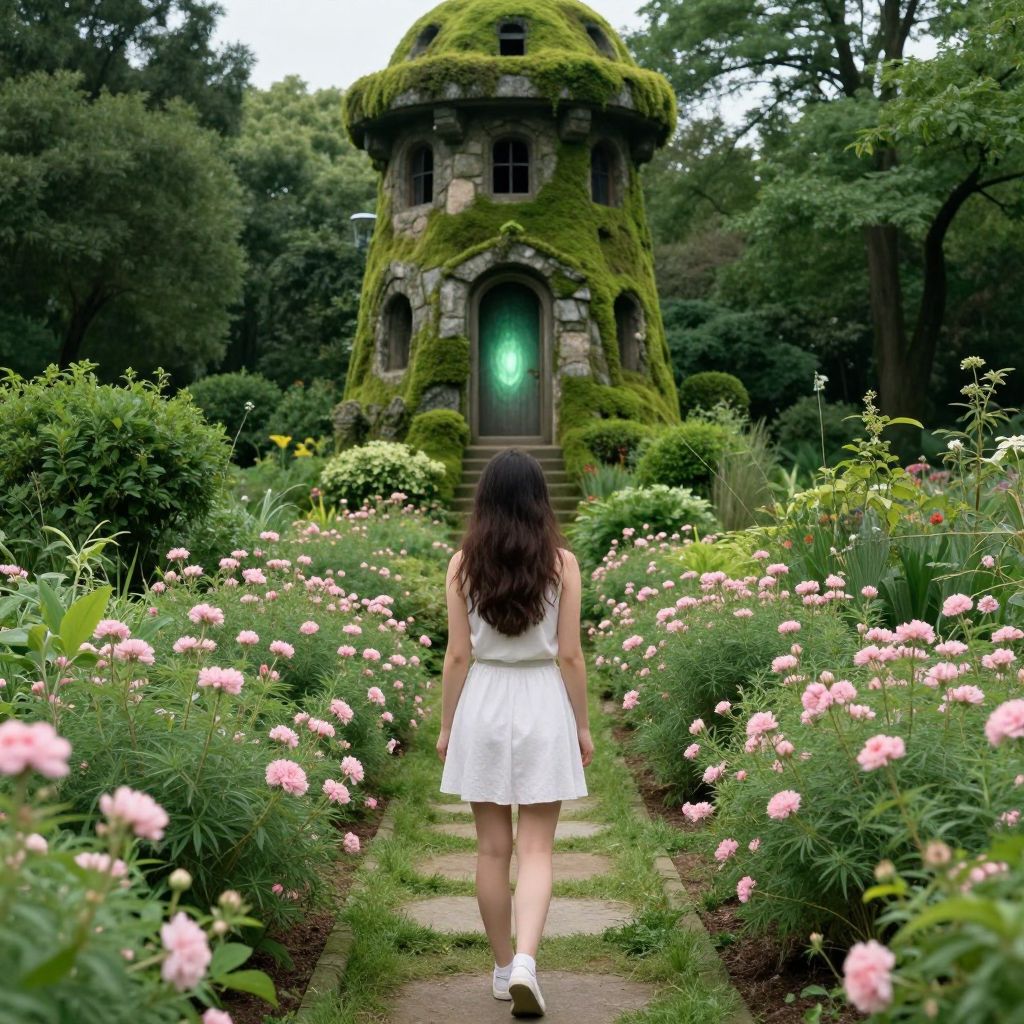 A young woman stands in a lush, green garden with pink flowers, leading up to a mysterious, moss-covered tower with a glowing door.