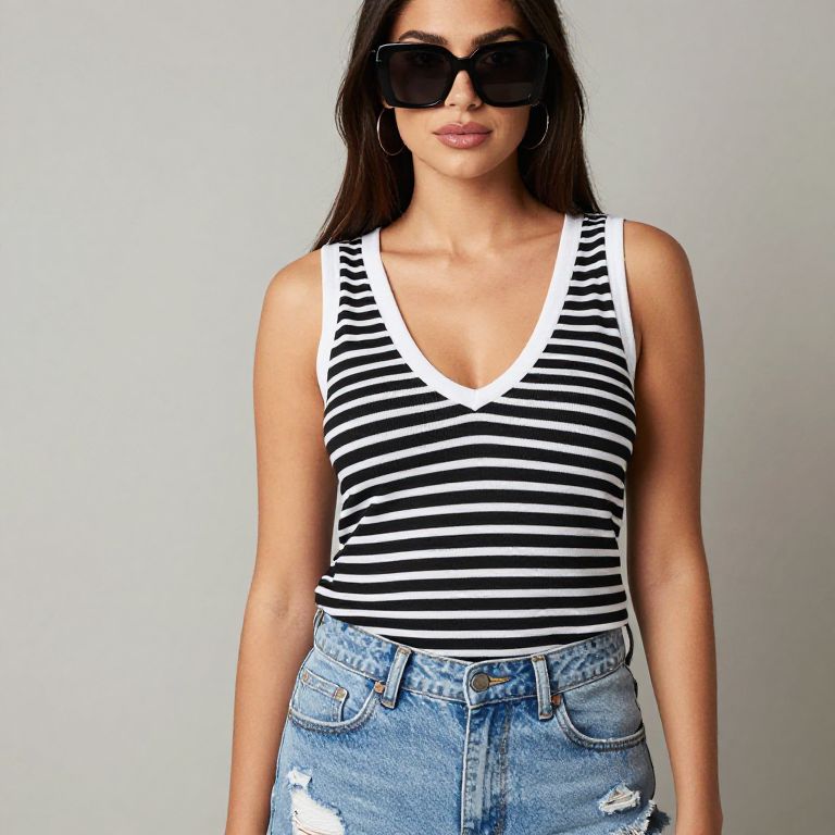 "Casual, sleeveless striped top in black and white, V neckline with white trim, relaxed fit, light-wash denim jeans, distressed details, oversized sunglasses.. Sexy. Pretty face and beаutiful eyes. Big breasts."