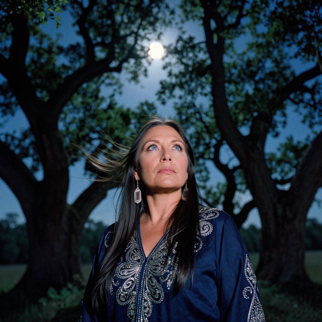 Imagine a portrait photograph, captured on film, of a Native American woman in her late 30s. The image, composed with a unique perspective, looks up at her from below, emphasizing her enigmatic gaze and piercing blue eyes. She is dressed elegantly in a midnight-blue gown, adorned with intricate silver embroidery. The setting is a starlit night, softened by moonlight filtering through ancient, gnarled trees that form an ethereal canopy. Standing in solitude within a forest clearing, she evokes a sense of wonder and reverence. Her expression, a blend of serenity and subtle melancholy, is enhanced by the gentle breeze rustling the leaves overhead, creating an emotional gradient that draws viewers into the mysteries beyond her crystalline eyes.