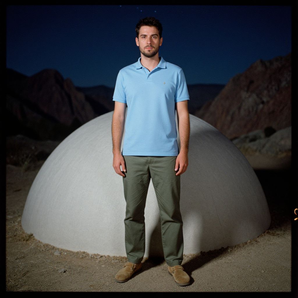 A man, sky blue polo, olive green khakis, tan suede shoes, lightweight performance fabric, relaxed fit, dome-shaped structure, starry night sky, surrounded by rugged mountains, daguerreotype film style, contemplative expression. Man has masculine face and piercing eyes