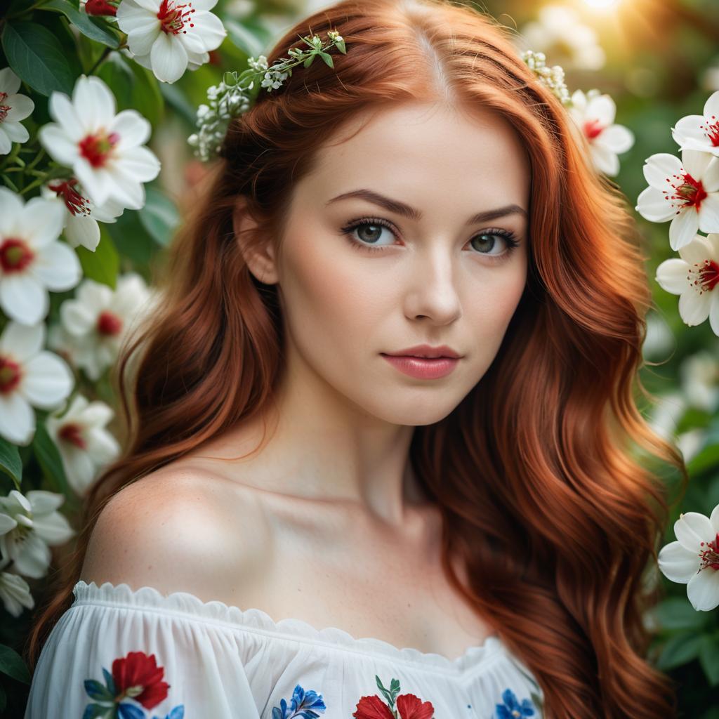A close-up portrait of a young woman with long, wavy natural red hair and blue eyes, soft warm lighting highlighting smooth, detailed skin texture, surrounded by blooming red and white flowers with green leaves, wearing an off-shoulder white top, romantic and serene atmosphere, detailed and realistic style