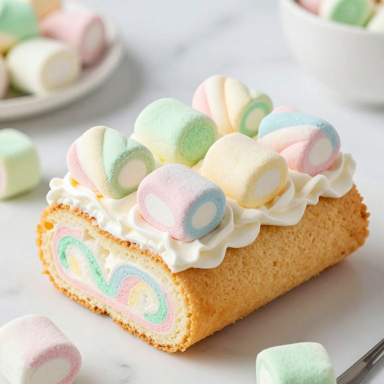 Colorful Lucky Charms marshmallows nestled inside creamy white frosting and rolled in golden sponge cake layers, creating festive and playful St. Patrick's Day treats.