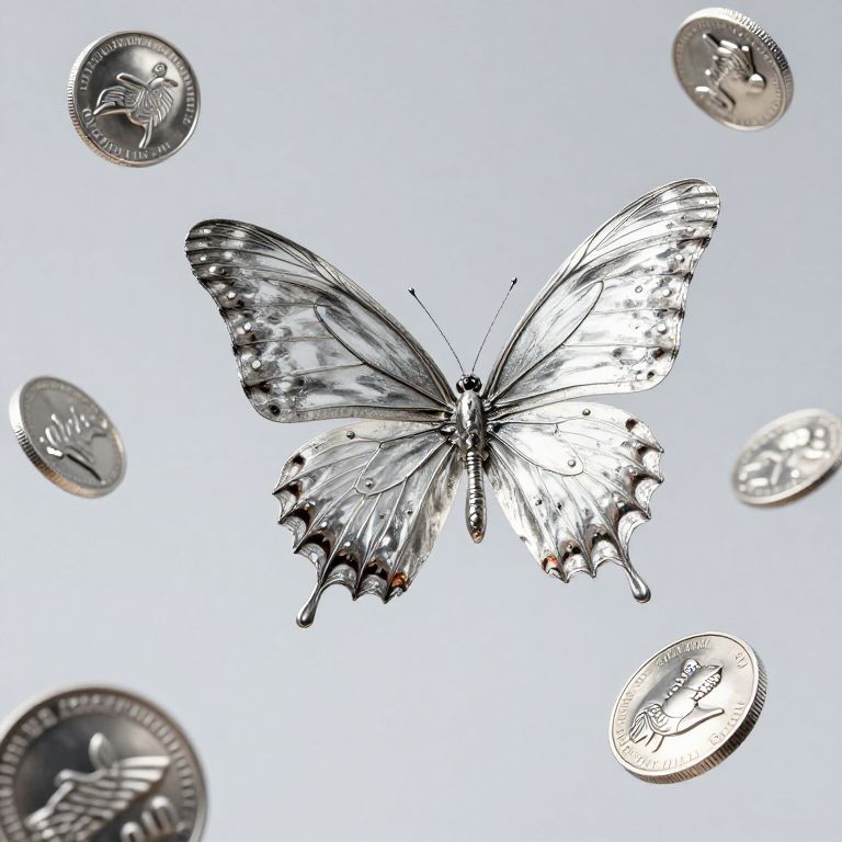 Photograph of a detailed, silver-colored, metallic butterfly with intricate black-speckled wings, centered against a light blue background. Surrounding the butterfly are five US quarters, slightly tilted and floating, each displaying different designs. The butterfly's wings are spread wide, showcasing delicate patterns and textures. The quarters are shiny and reflective, contrasting with the matte finish of the butterfly. The overall composition highlights the delicate artistry of the butterfly against the industrial, metallic appearance of the coins. The image combines natural and man-made elements in a visually striking manner.