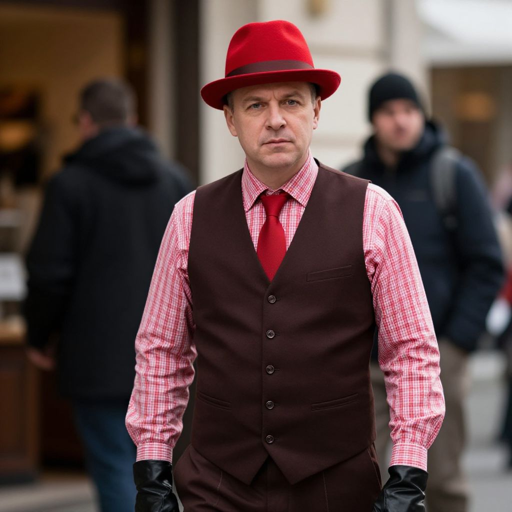 A man with a red hat and a red and white checkered shirt is wearing a brown vest, red tie, and black gloves. He is standing in front of a store with a man in the background.