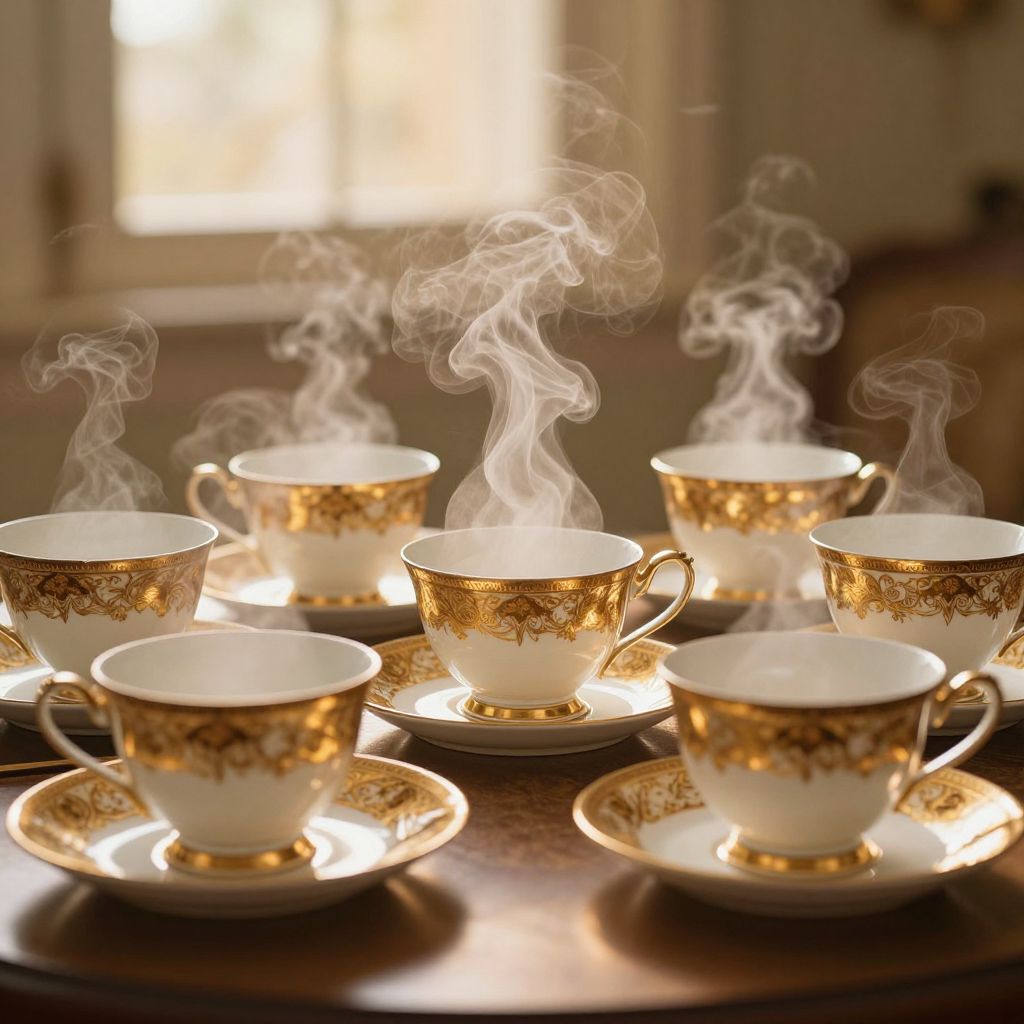 Golden-hour lighting bathes a tableau of ornate teacups, their intricate gold patterns and rising steam creating a symphony of elegance and warmth, evoking a serene, vintage ambiance.
