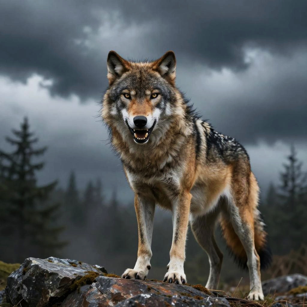 Angry alpha wolf standing fiercely on a rocky outcrop under a stormy sky, sharp teeth bared, intense glowing eyes, fur ruffled by the wind, surrounded by a misty forest, dramatic lighting, cinematic mood, hyper-realistic details.