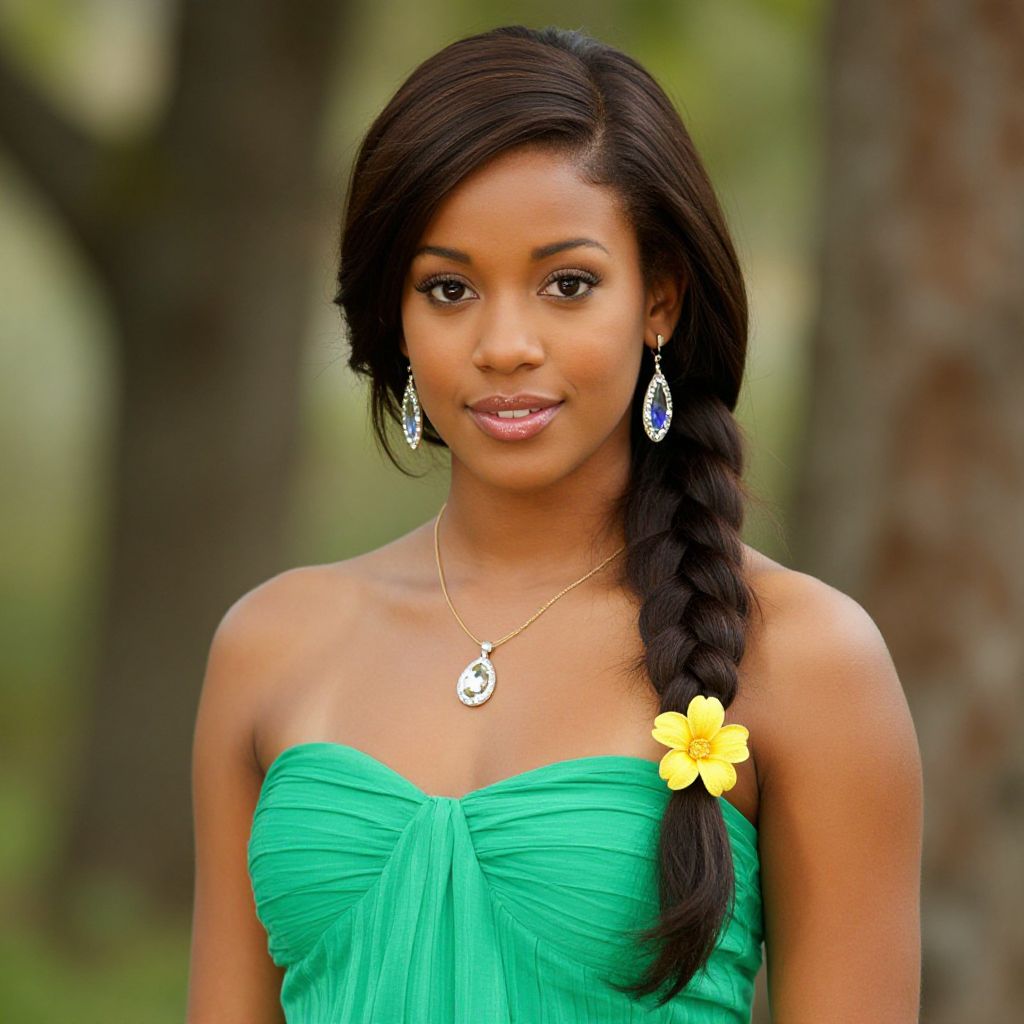 Photograph of a beautiful Black woman with long braided hair, wearing a green strapless dress, yellow flower, and silver jewelry, standing in a