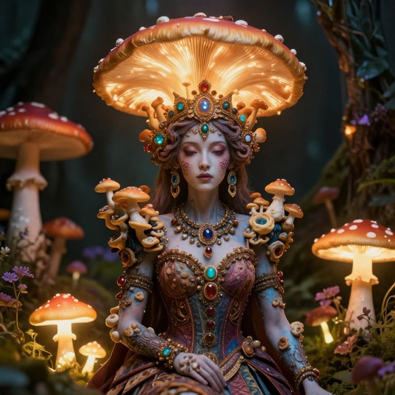 The image depicts a highly detailed and hyper-realistic depiction of a female mushroom queen creature, exuding a sense of whimsy and fantasy. Her skin is adorned with growths that resemble mushrooms, adding to her unique appearance. She is dressed in an elaborate outfit, featuring intricate patterns and textures, with a prominent headpiece that is a combination of mushrooms and jewels, glowing with a warm, ethereal light. The headpiece is decorated with various gemstones and intricate designs, enhancing her regal presence. Surrounding her are vibrant, glowing mushrooms and flowers, creating a magical and enchanting atmosphere. The overall composition is rich in color and texture, with a harmonious blend of warm and cool tones, and the spatial relationships between the elements are carefully arranged to create a balanced and visually appealing scene. The image is a testament to the artist's skill in capturing the essence of a fantastical world, where nature and fantasy intertwine in a beautiful and captivating manner.