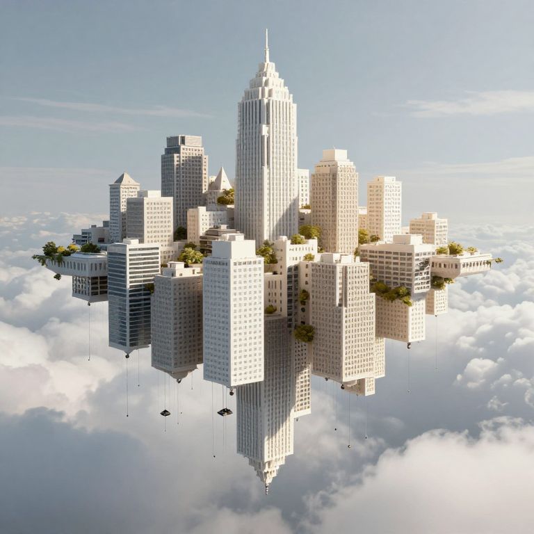 Photorealistic CGI image of a floating cityscape composed of tall, white skyscrapers with modern architecture, reflecting below on a sea of fluffy white clouds. The tallest building is centrally located, surrounded by various high-rises. Small green trees are visible on rooftops, adding a touch of nature. The sky is a clear, bright blue with subtle gradients. The buildings are evenly spaced, creating a balanced, symmetrical appearance. The image has a surreal, dreamlike quality, emphasizing the contrast between the urban structures and the cloud-covered background.