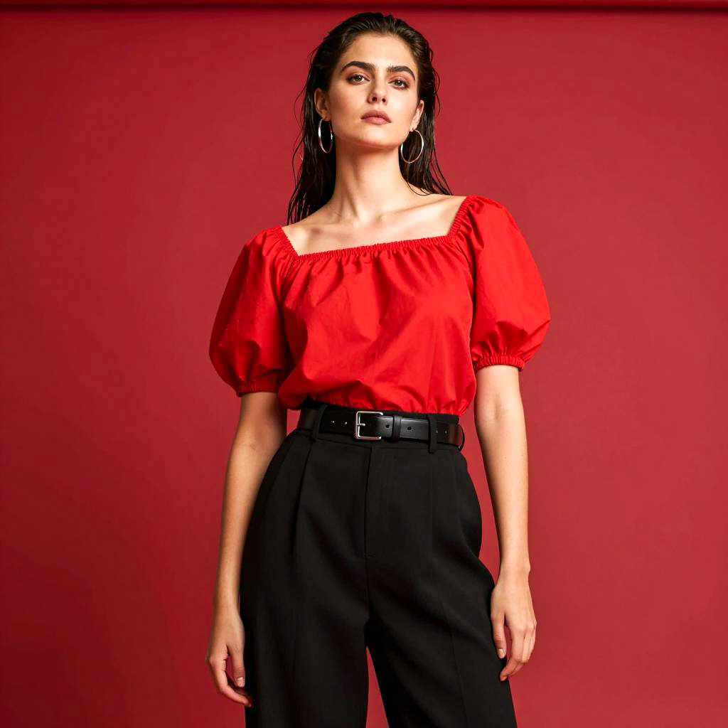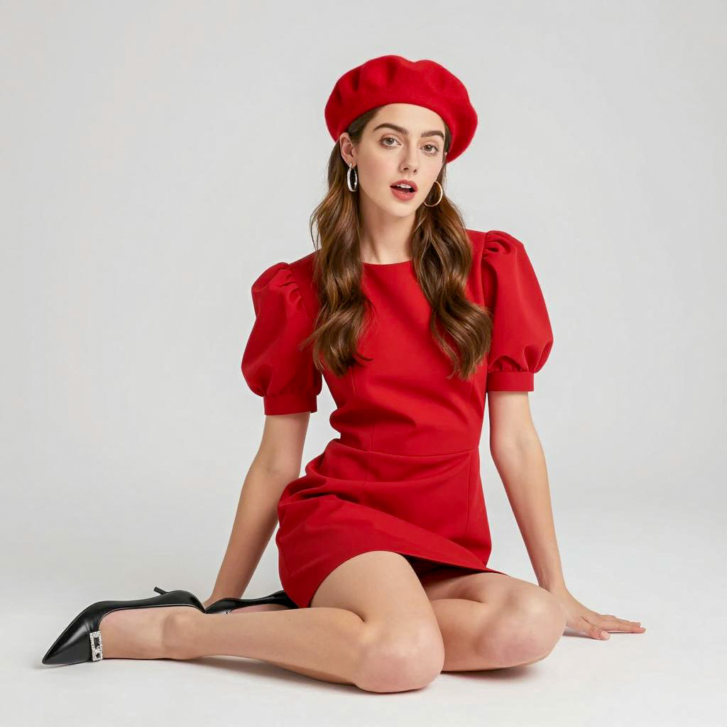 Photograph of a tall, slender woman with fair skin and red lipstick. She wears a strapless, red, one-shoulder jumpsuit with a large bow at the chest. Her hair is under a wide-brimmed red hat. She stands against a red, ured wall, leaning slightly to the right with hands on her hips. A wooden chair is to her left. She wears red high heels. Her expression is neutral. The overall color scheme is red.