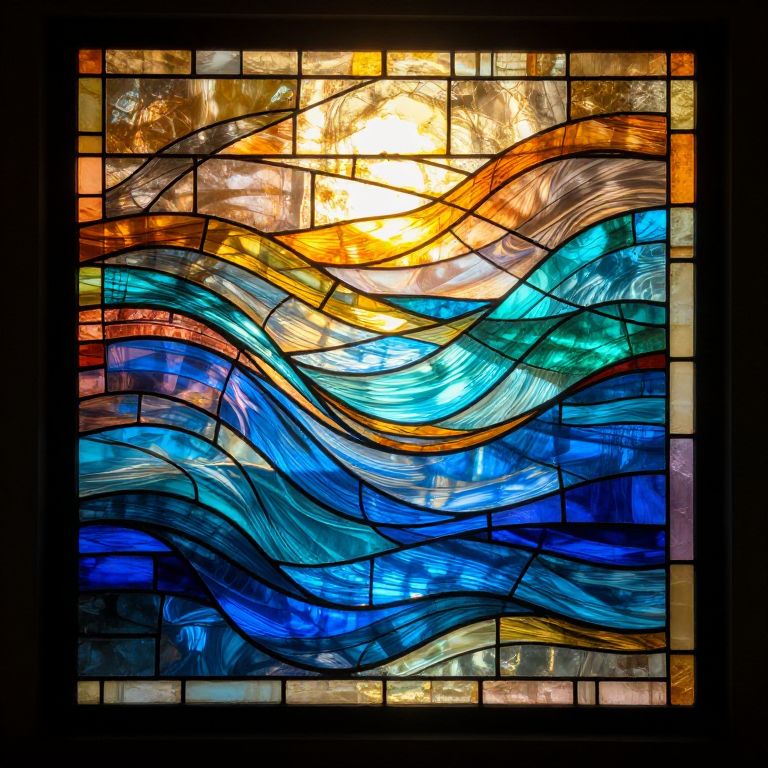Stained glass flux visualization demonstrating a modern reinterpretation of classic stained glass artistry, with dynamic glass waves and pulsing hues blending seamlessly in a luminous flux state beneath dramatic lighting and textured backgrounds.