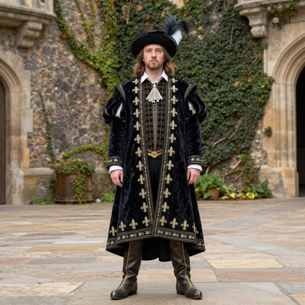 Lord Capulet costume inspired by Shakespearean drama, presenting a stately figure wearing a velvet robe with embroidered fleur-de-lis, a feathered hat, and regal boots, standing amidst a medieval castle courtyard with ivy-covered stone walls.