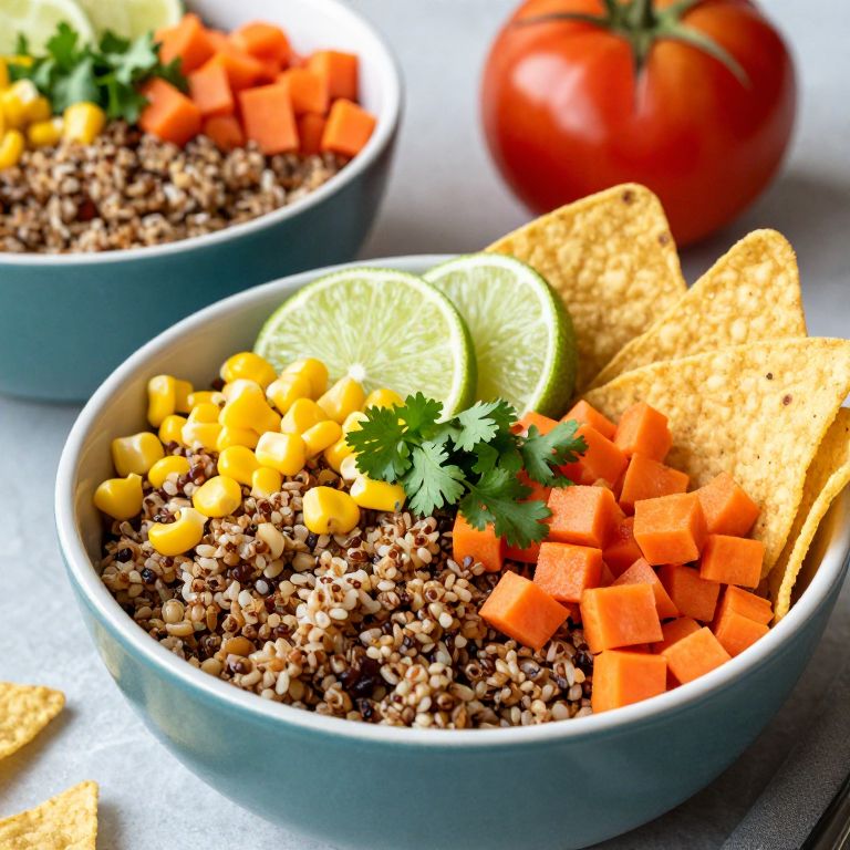 Vibrant Mexican-inspired quinoa bowl topped with diced carrots, corn kernels, fresh cilantro, and lime slices, served alongside golden tortilla chips and accompanied by a second bowl and a tomato in the background.