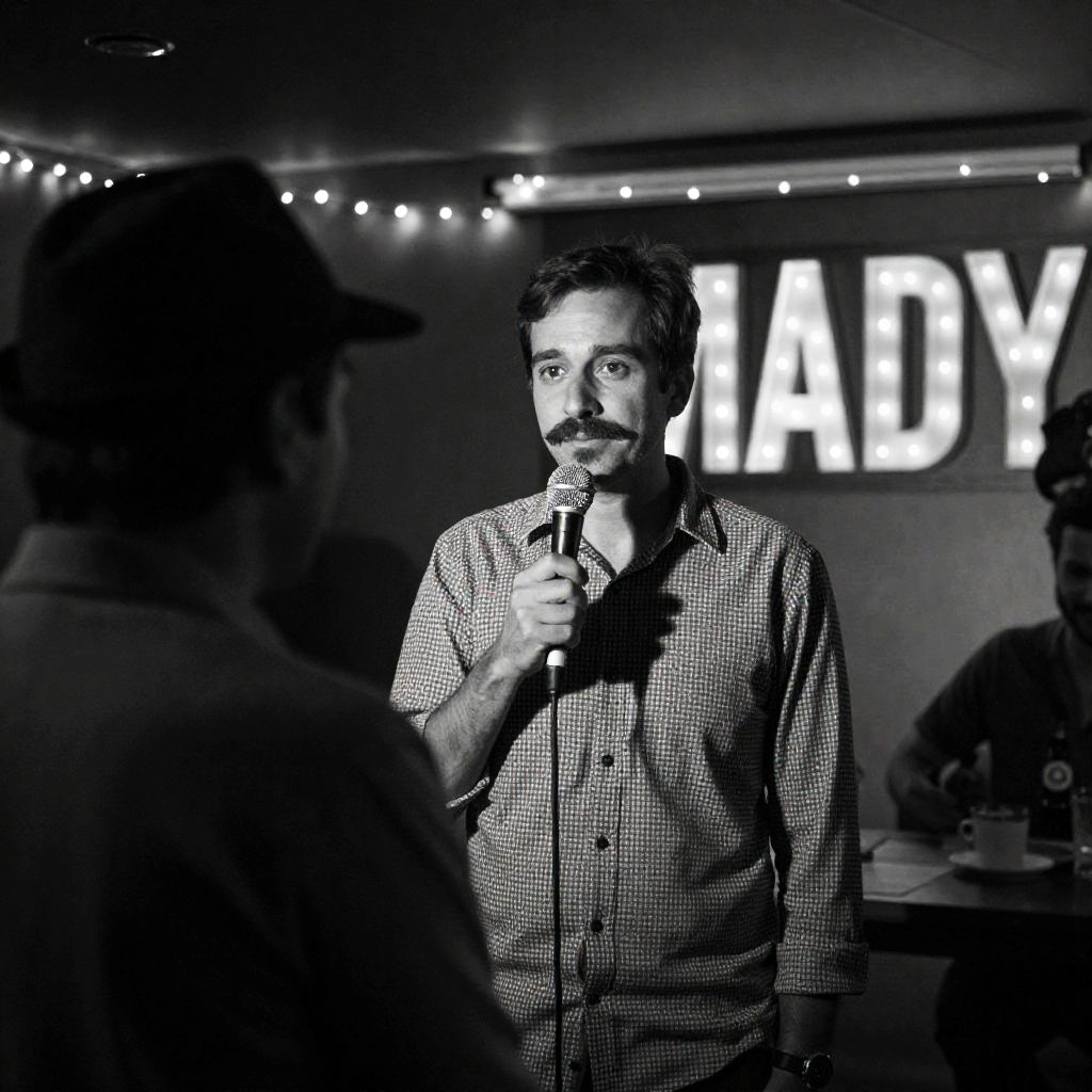 Black-and-white photograph of a man with a mustache and checkered shirt, holding a microphone, standing in a dimly lit room with string lights and decorations. Another person with a hat faces him. Decorated sign in background.