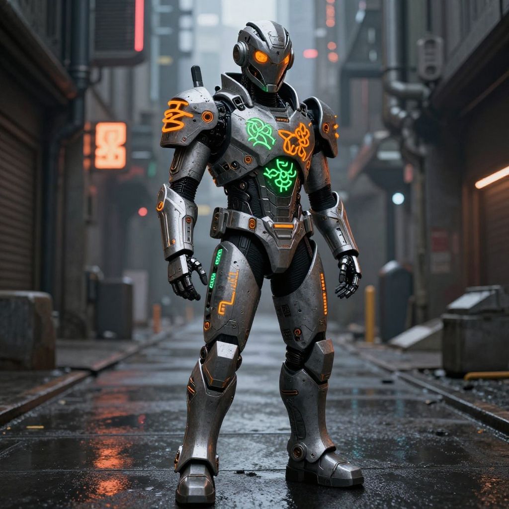 Photorealistic digital artwork of a futuristic, armored humanoid robot standing in a rain-soaked, neon-lit urban alley. The robot has a sleek, metallic silver body with orange and green glowing accents, intricate patterns, and a menacing, visor-like orange headlamp. Its armor features geometric designs and is equipped with various mechanical details. The alley is dimly lit with glowing signs in the background, and the wet street reflects the neon lights. The atmosphere is dystopian, with industrial elements and a sense of urban decay. The robot's stance is strong and confident, exuding a sense of power and readiness.
