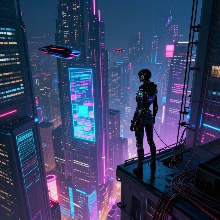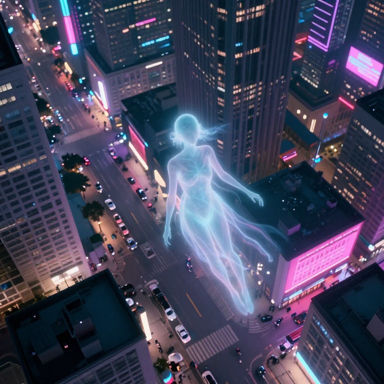 A surreal digital artwork unveils an enigmatic being emerging from a wormhole, its form gracefully shifting between ethereal wisps and solid matter as it navigates through a vivid, neon-lit urban setting. The arrangement skillfully combines sci-fi motifs with the dreamlike, fluid style akin to surrealist paintings. Observers are drawn into this mesmerizing scene from an aerial perspective, where the interplay of radiant hues and stark shadows envelop both the entity and its surroundings, evoking a range of feelings from wonder to unease as it blurs the boundaries between reality and fantasy in this breathtaking composition.