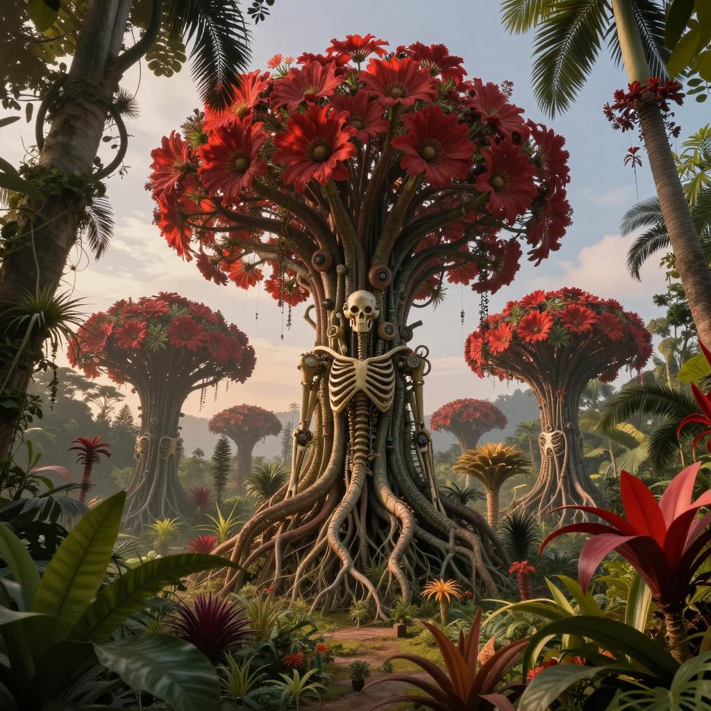 A surreal scene depicting bold, biomechanical trees with intricate root systems and vibrant red flowers resembling genetically modified plants. Each tree incorporates a mechanical exo-skeleton featuring human-like skeletons integrated into the trunks. The lush jungle environment is illuminated by warm epic sunset light, blending elements of transhumanistic utopia and futuristic design influences with detailed and sharp visuals.