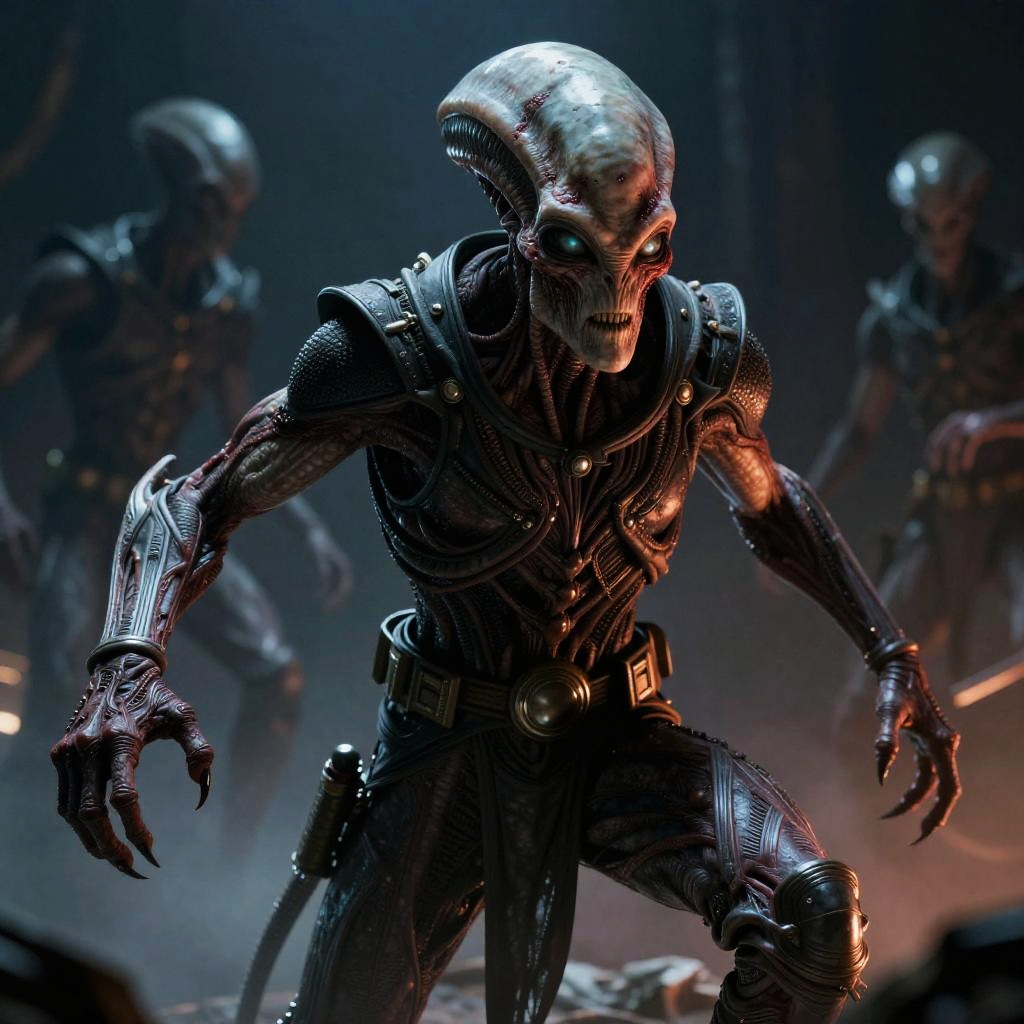 High-quality cinematic image of a detailed elderly alien Sith with visible corruption marks on the face. The creature has a grimdark, cyberpunk aesthetic featuring intricate textures, glowing eyes, and a dark, volumetric-lighting environment. The alien is in a dynamic pose with armor-like elements on the body, reminiscent of sci-fi and Star Wars themes. The image is color graded with film grain effects and presents a striking, eerie atmosphere.