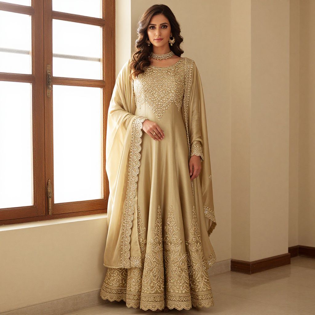 Photograph of a South Asian woman with medium-dark skin and long, wavy dark brown hair standing in a sunlit room. She wears an elegant, gold-colored traditional long kurta with intricate embroidery on the bodice and hem, paired with matching long sleeves. She accessorizes with a gold necklace and earrings. The background features a large wooden-framed window with bright white light streaming in, casting soft shadows on the cream-colored walls and light-colored floor. Her expression is calm and confident, with a slight smile. The overall style is traditional and sophisticated.