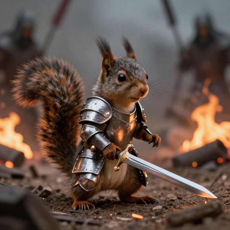 Photograph of a small squirrel in shiny medieval armor, holding a sword, surrounded by blurred, armored figures and glowing fires.