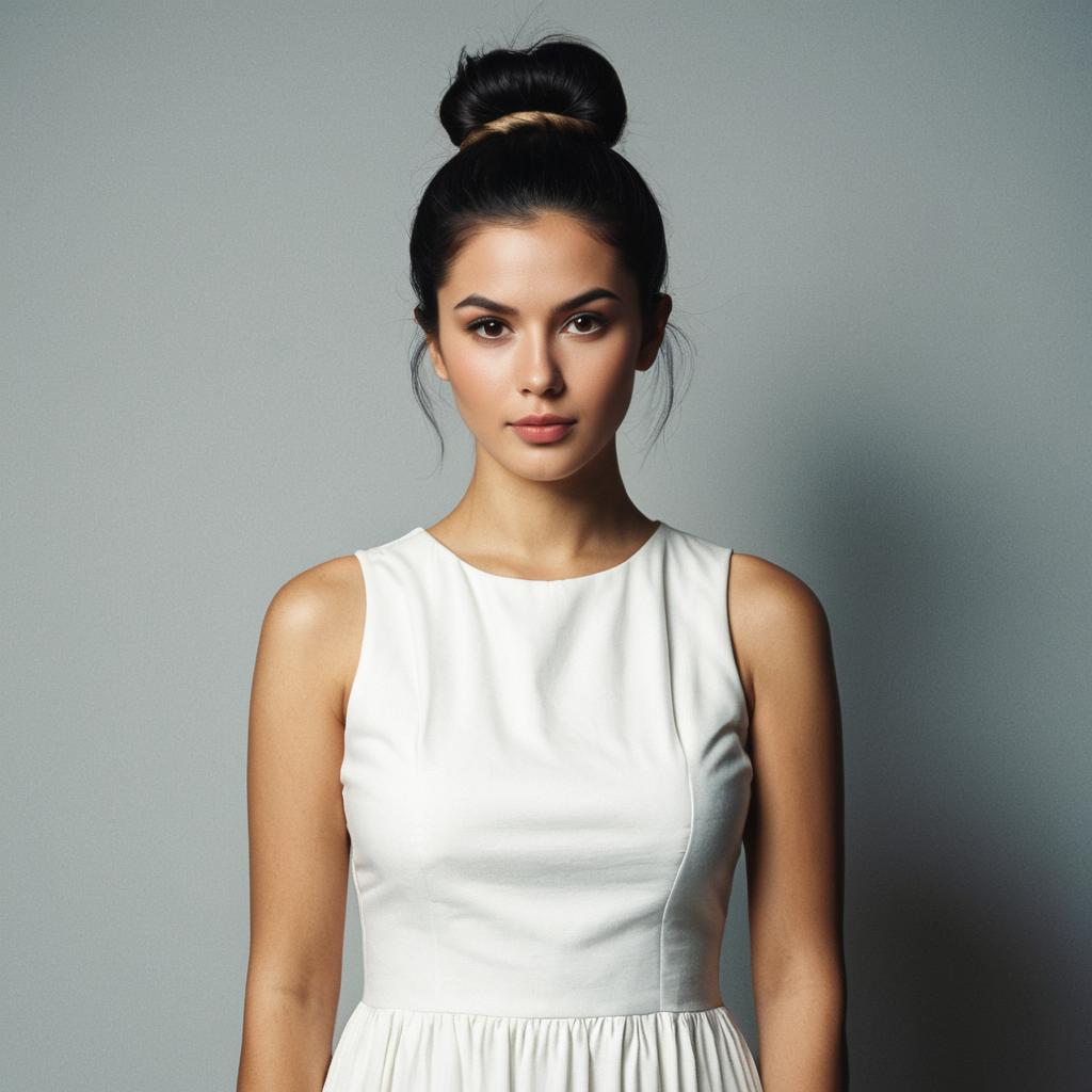 Vintage clothing,1girl, solo, dress, realistic, brown hair, pink dress, hair bun, looking at viewer, short sleeves, brown eyes