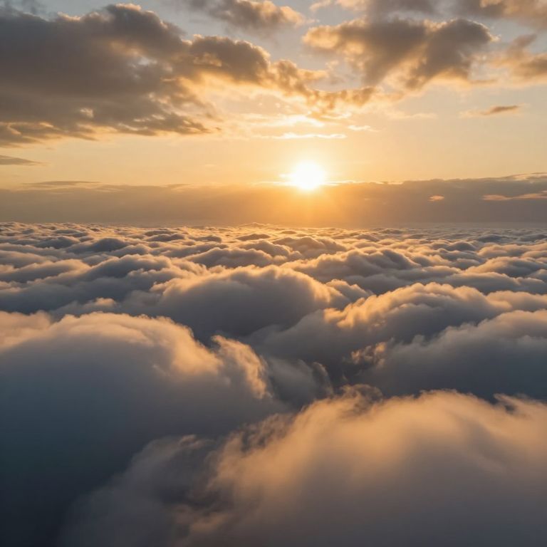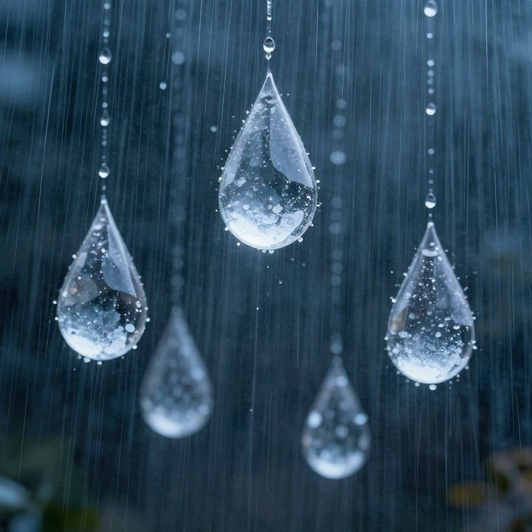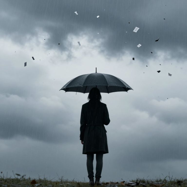 An ethereal mountain of umbrellas ascends toward the heavens under eternal rain, symbolizing resilience amidst chaos, while the sunlit sky above whispers hope and serenity.