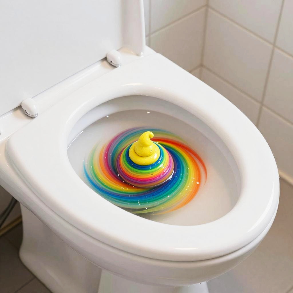 Rainbow poop in toilet bowl, vibrant swirling colors mixing in water, bathroom scene with bright tiles, playful and whimsical art style, high detail