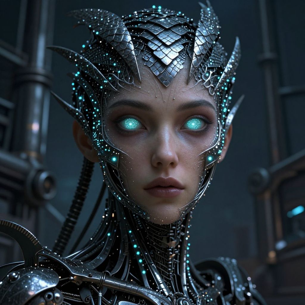 In the style of biomechanical art, this portrait reveals an otherworldly entity from a unique perspective, blending human and machine features seamlessly. The creature's eyes glow with LED lights, reminiscent of flickering stars, while its skin is covered in intricately designed metal scales that pulse with bioluminescent light. These scales merge into the shadows around it, creating an enigmatic aura against a backdrop of towering machinery, evoking both fascination and unease as viewers contemplate the intricate balance between humanity and technology within this mysterious being.