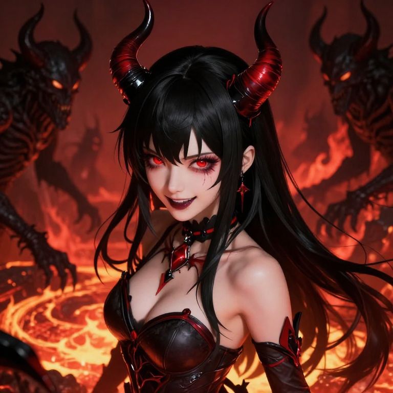 Dark fantasy scene featuring an evil devil anime girl with sleek black and red horns, piercing red eyes, long black hair, and a seductive yet dangerous smile, surrounded by shadow creatures in a fiery hellscape with molten lava pools.
