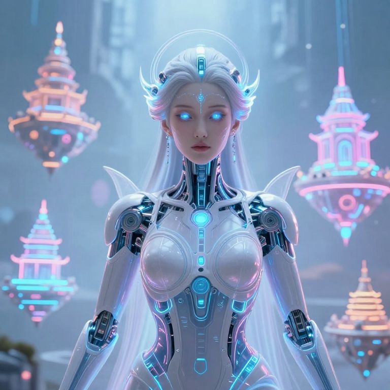 Digital artwork of a glowing, cybernetic, white-haired woman with blue eyes, neon accents, and futuristic armor, surrounded by floating, neon-l