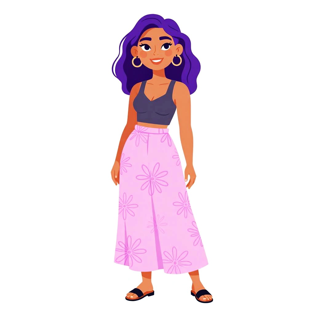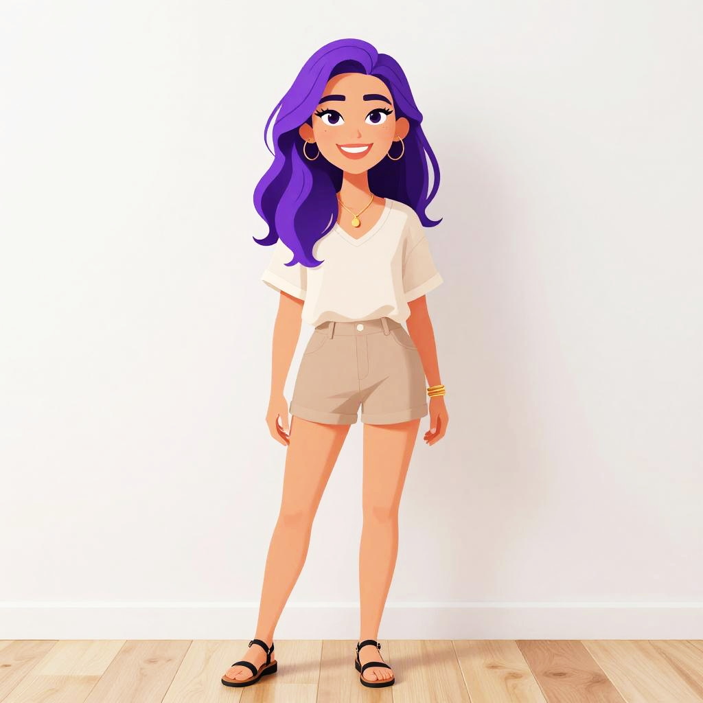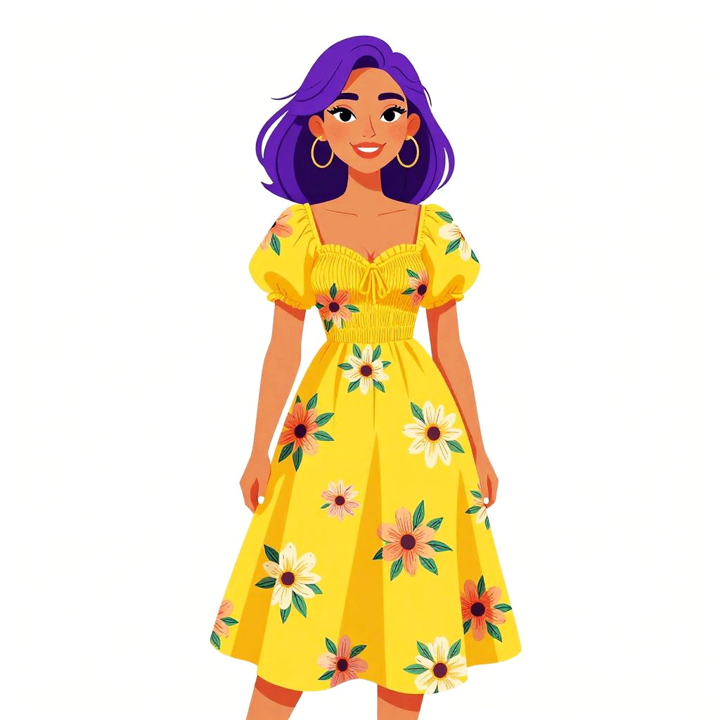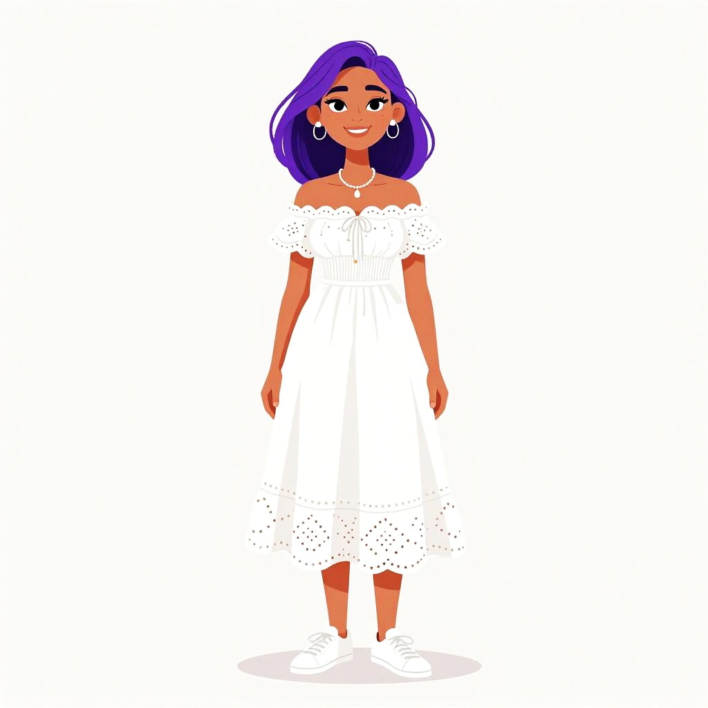 Woman with pretty face and pretty hair. smiling Woman, boho chic, white off-the-shoulder midi dress with eyelet embroidery, ruffled neckline, smocked bodice, tiered skirt with scalloped hem, casual white sneakers, minimal jewelry, studio background with clean white backdrop. --sref 1467