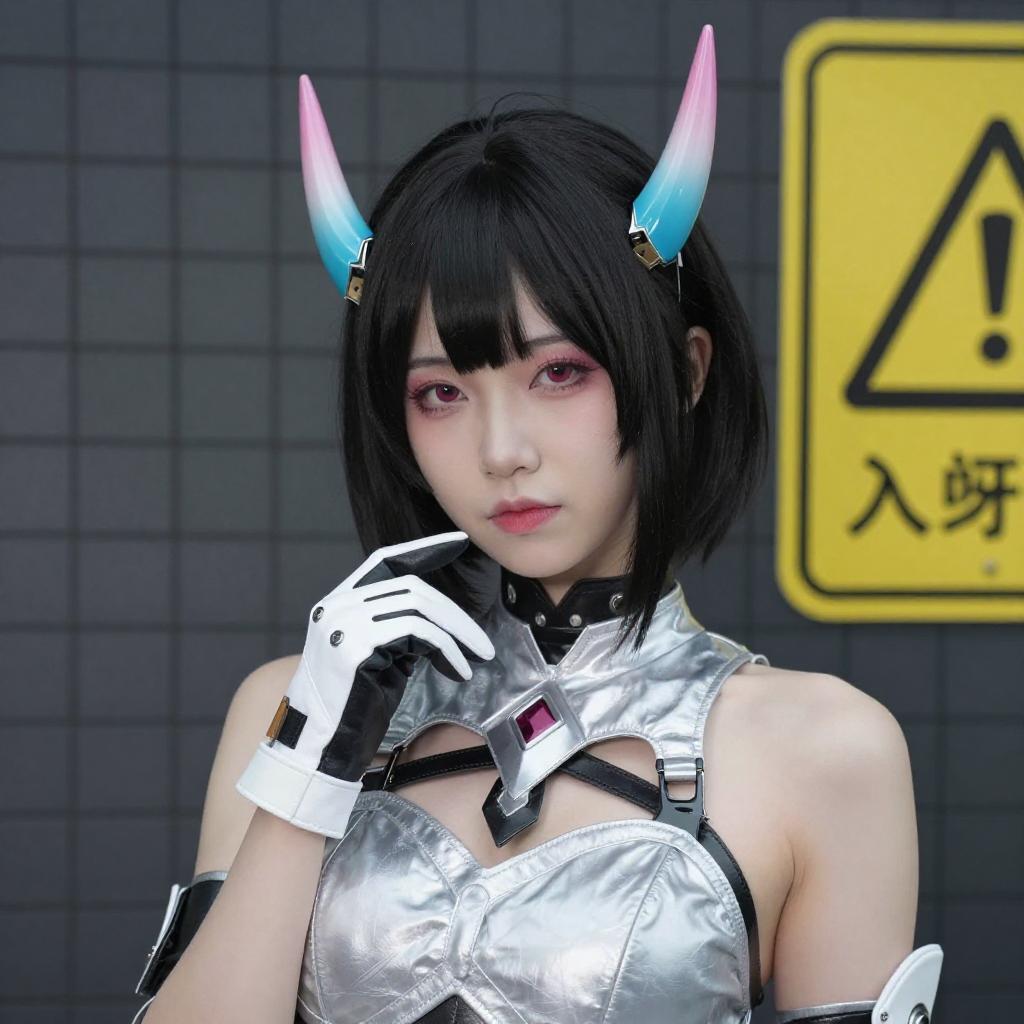 Photograph of an Asian woman with pale skin and black bob haircut, wearing a silver and black futuristic cosplay outfit with pink and blue horn-like accessories. She holds a black and white glove near her face, with a black tiled wall and yellow warning sign in the background. Her expression is neutral, with pink eye shadow and red lipstick.