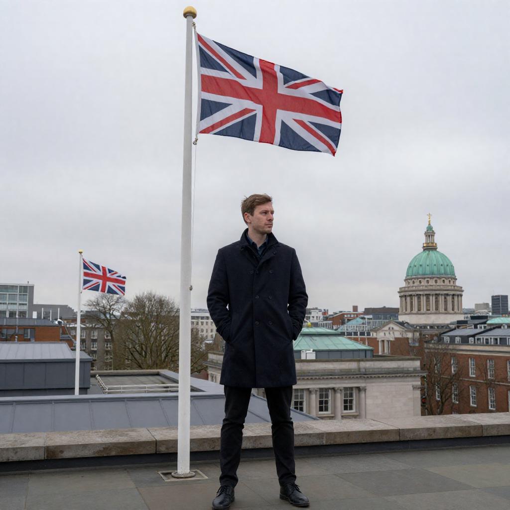 Man in black coat stands on rooftop, facing London skyline. Urban buildings with flags in background, Big Ben prominent. Union Jack flag on nearby building. Man with short hair, back to viewer. Overcast lighting. Rooftop parapet in foreground.