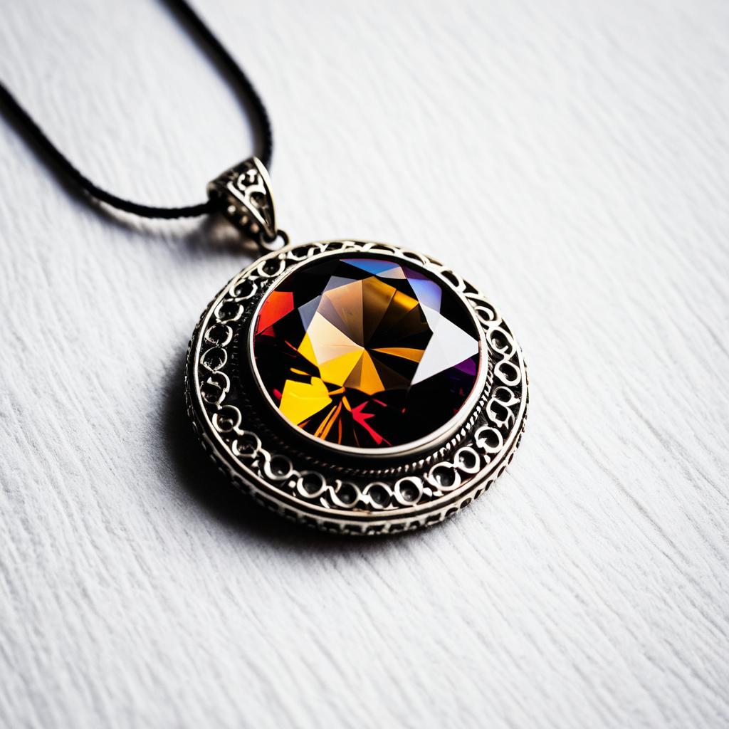 Close-up macro photograph of a luxury pendant featuring a large, multicolored faceted jewel set in an intricately detailed silver frame. The pendant is attached to a black cord and placed on a white textured background, highlighting the vivid colors and craftsmanship of the jewelry piece.