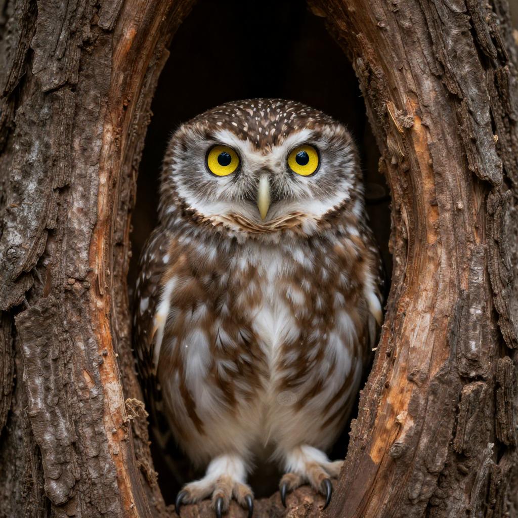 A close-up photograph of a small owl with intense yellow eyes, perched inside a hollow tree. The tree bark is rough and textured, with shades of brown and orange. The owl's white and brown feathers blend into the tree's crevices. The image has a watermark in the center. The owl looks directly at the camera, creating a sense of curiosity and focus.